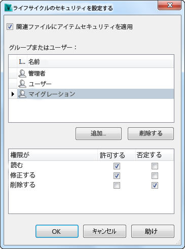 項目のライフタイム セキュリティを設定する」に記載されている手順に従って、Migration ユーザを項目のライフサイクル セキュリティに追加します。項目にアタッチされたドキュメントの読み取りおよび修正権限をこのユーザに追加します。マイグレーション プロセス中にデータを削除する必要はありませんので、予防措置として削除権限は拒否します。