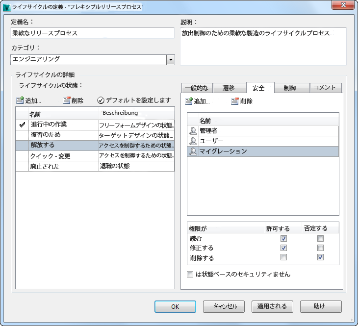 [定義]タブで、Inventor データに関連付けられたライフサイクル スキームを選択します。ドキュメントの読み取りおよび修正権限を持つ Migration ユーザが各ライフサイクル状態(「リリース」など)に追加されていることを確認します。