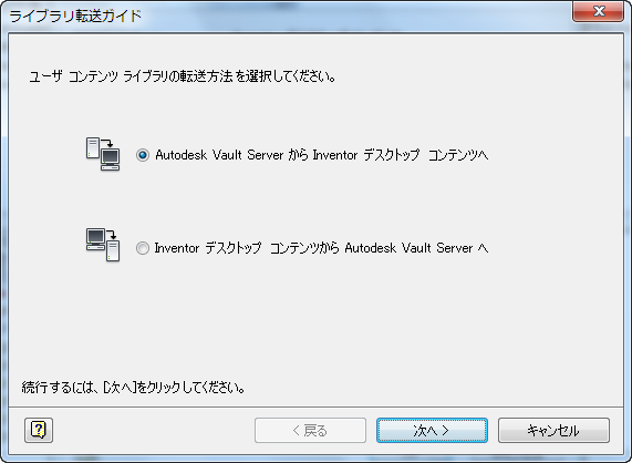 - [ライブラリ ガイドを転送...]ボタンをクリックし、[ライブラリ ガイドを転送]ダイアログ ボックスを開きます。図 2 を参照してください。[Autodesk Vault Server から Inventor デスクトップ コンテンツへ]を選択します。