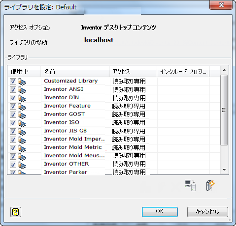 - [プロジェクト]ダイアログ ボックスで、[コンテンツ センター ライブラリの設定]ボタンをクリックし、[ライブラリを設定]ダイアログ ボックスを開きます。図 1 を参照してください。