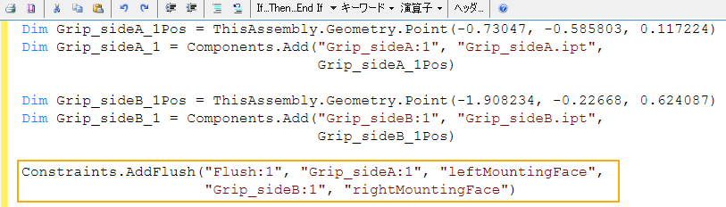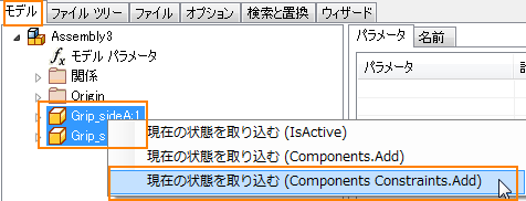 - アセンブリ ファイルで、[ルールを編集]ダイアログ ボックスの[モデル]タブから、パーツ名を複数選択して右クリックし、コンテキスト メニューから[現在の状態を取り込む(Components Constraints.Add)]を選択します。