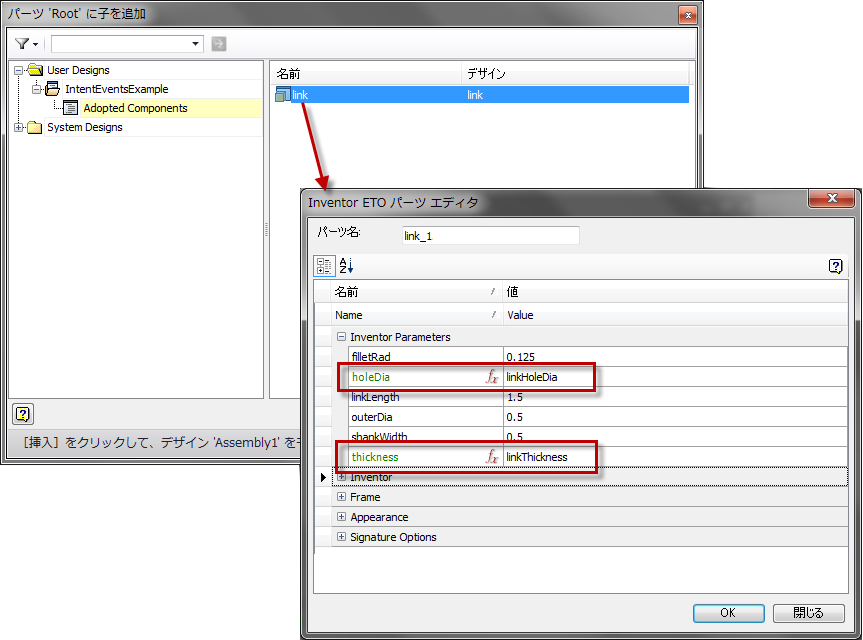 Design Chain : DynamicRuleReactorExampleRoot IvAssemblyDocument Parameter Rule linkHoleDia As Number = 0.375 Parameter Rule linkThickness As Number = 0.250