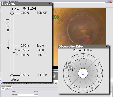 検査データの確認を簡素化するために、検査エディタでは、管の検査セクションの側面リプレゼンテーションが表示されると同時にセクションの長さに沿った特定の距離における破損コードが表示されます。観測エディタでは、検査済みセクションの内側のグラフィカル リプレゼンテーションが表示されます。