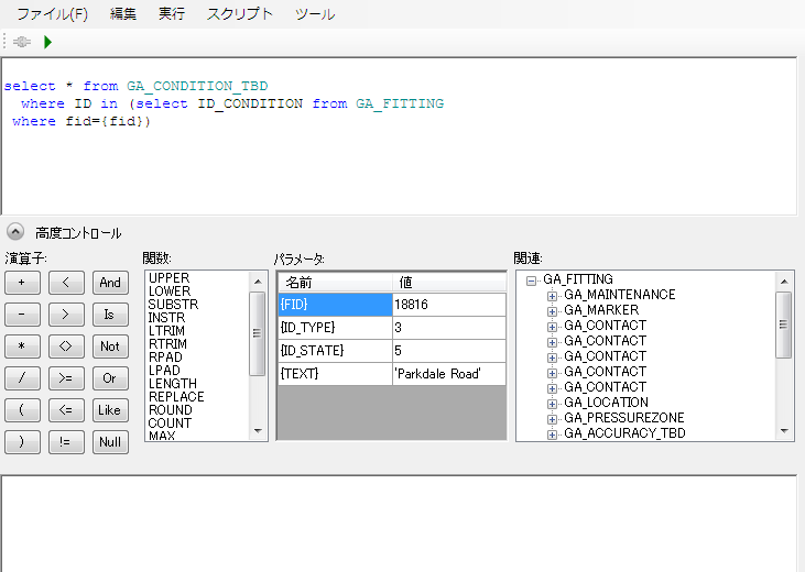 ガス データベース スケマティックでは、GA_FITTING フィーチャ クラスは GA_CONDITION_TBD フィーチャ クラスとのリレーションを保有しています。CONDITION をクエリーし、フォームに表示します。