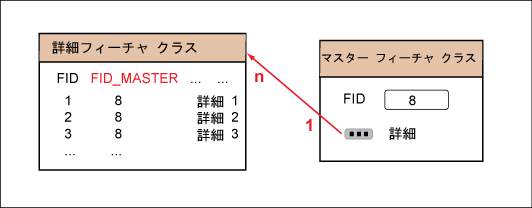 マスター - 詳細のリレーションでは、1 つのフィーチャ クラスが別のフィーチャ クラスとのマルチリレーションを持つことができます。たとえば、建物などのマスター フィーチャは複数の詳細フィーチャを持つことができます。 同様に、各フィーチャは複数のラベルを持つことができます。