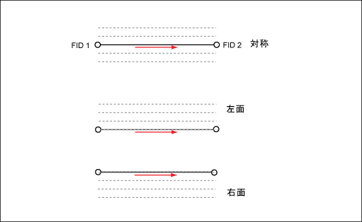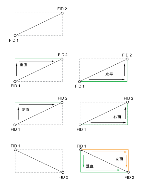 2 つのポイント間のラインの方向は FID から派生します。たとえば、ラインは FID 1 から FID 2 まで作成され、垂直または水平方向に、左からリアル ワールド フィーチャまで、または右からリアル ワールド フィーチャまで描画されます。
