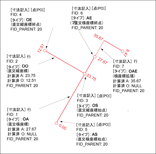 基線の拡張に基づく直交寸法記入。たとえば、ビルディングのエッジを横座標として使用します。構成コンポーネント: