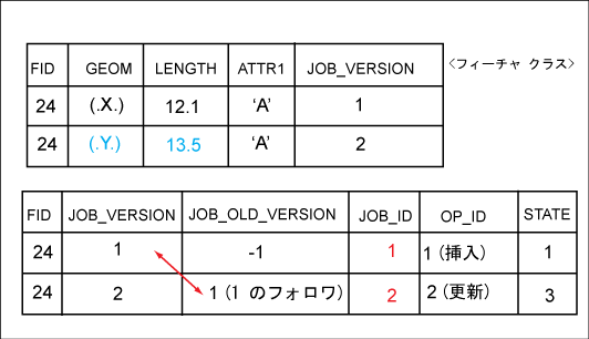 ユーザが特定のジョブ(JOB_ID)で作業していて、たとえばフィーチャを変更した場合、操作は TB_JOB_VERSION に次のように登録されます。