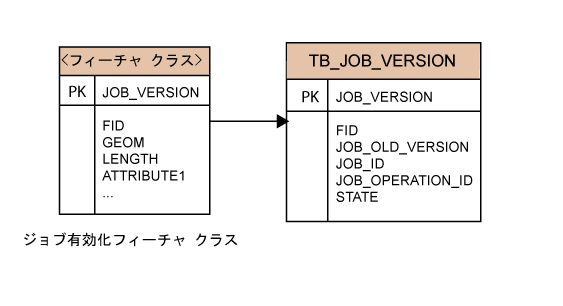 テーブル TB_JOB_VERSION には、すべてのフィーチャの完全な履歴が格納されます。フィーチャー テーブルは 1 つのジョブ関連属性 JOB_VERSION を持っています。テーブル TB_JOB_VERSION は表示されるフィーチャもコントロールします。