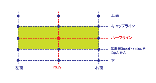 テキスト ボックスに対して垂直にテキスト ボックス挿入点を指定します。[下]、[基線]、[ハーフライン]、[キャップライン]、[上]を選択します。既定値は[ハーフライン]です。 |