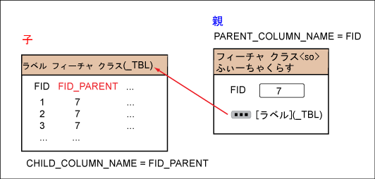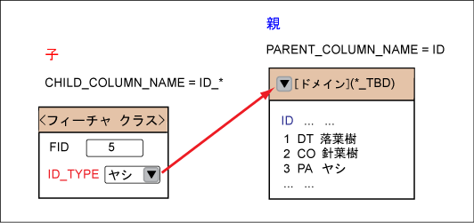 次の図は、フィーチャー テーブルとドメイン テーブル間のリレーションを示しています。