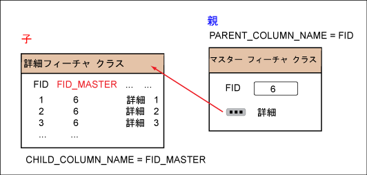 次の図は、マスタ テーブルと詳細テーブル間のリレーションを示しています。
