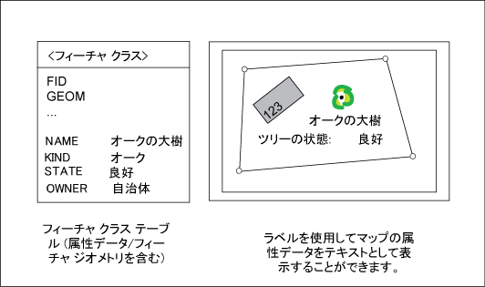 データ モデル: フィーチャー テーブルとラベル フィーチャ クラス間のリレーション。属性自体(木の名前 = Great Oak)はフィーチャと一緒に保存されます。この値をテキストとしてグラフィックスに表示するには、ラベルを生成します。