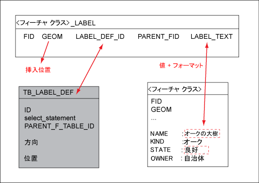 例: ラベル フィーチャ クラス TREE_TBL は、木の種と生命力を表示するテキストを含んでいます。属性データを格納する親フィーチャ クラスは TREES です。