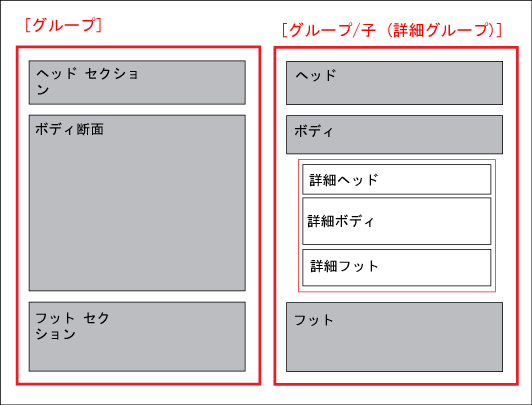 レポート レイアウトには、ヘッダー、本文、およびフッター セクションを含むグループ、および子グループを含むグループが表示されます。