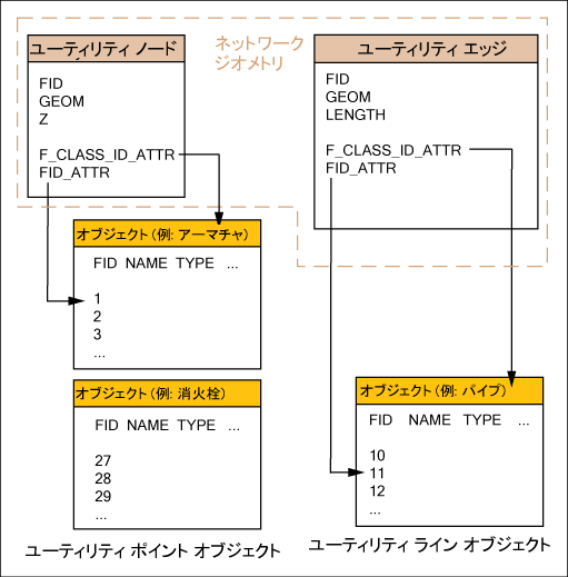 ユーティリティ データ モデルは、2 つのジオメトリ フィーチャに格納されているノードとエッジ、および属性フィーチャ クラスに格納されている属性データで構成されています。各ユーティリティ フィーチャはジオメトリ フィーチャによって記述され、特定の属性とその関連属性フィーチャを持ちません(また、拡張してはなりません)。つまり、ノード タイプは関連属性フィーチャにより決定されます。