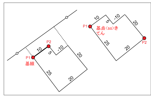 [直角なコース]機能を使用して、建物の線の定義を構築します。ただし、少なくとも 2 つの座標(既存の点)が定義され、直角(境界線のサイズ)がその点の間で計測されている必要があります。
