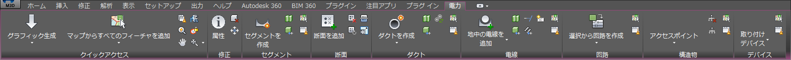 Electric リボン タブを使用すると、AutoCAD Map 3D toolset Electric の最も一般的な操作を行うことができます。たとえば、[セグメント]パネルを使用してセグメントを作成し、[断面]パネルを使用して断面を追加、[ダクト]パネルおよび[電線]パネルを使用してダクトや電線を追加することができます。[回路]パネルを使用して、フィーチャを選択またはトレースを実行して、回路を定義します。[ストラクチャ]パネルおよび[デバイス]パネルを使用して、ストラクチャやデバイスを追加します。Electric リボン タブを使用して作成したフィーチャは、電力エクスプローラの該当するコンテナに表示されます。「電力エクスプローラ」を参照してください。