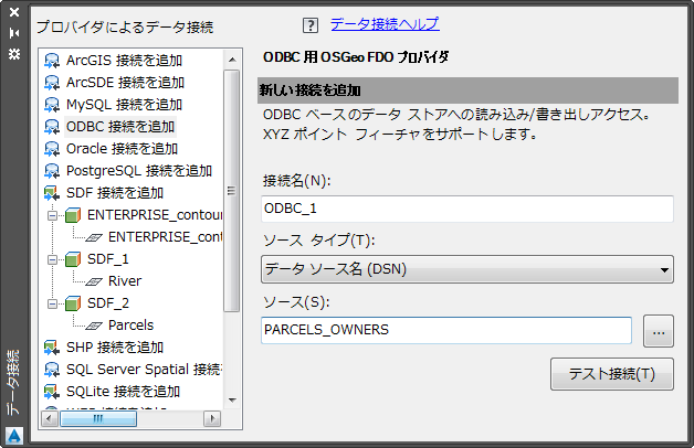 [データ接続]ウィンドウで、新しい接続を指定します。ODBC ソースからマップに特定のフィーチャ クラス画層を追加しないでください。ODBC ソースに接続すると、すべての情報が AutoCAD Map 3D toolset で自動的に利用できるようになります。