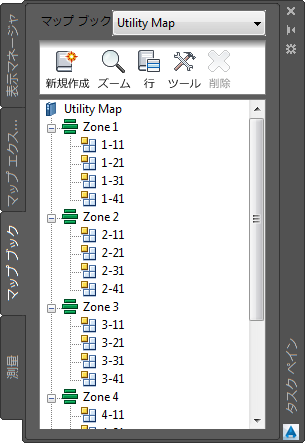 [マップ ブック]タブでは、スタイル設定されたマップから印刷マップ、マップ ブック、複数ページの DWF を作成できます。[マップ ブック]は、AutoCAD シート セット マネージャを使用して、地図帳のページのように、マップ ブックにタイルのツリー表示を設定します。ナビゲーション矢印を使用して、マップ内のタイル間を移動します。