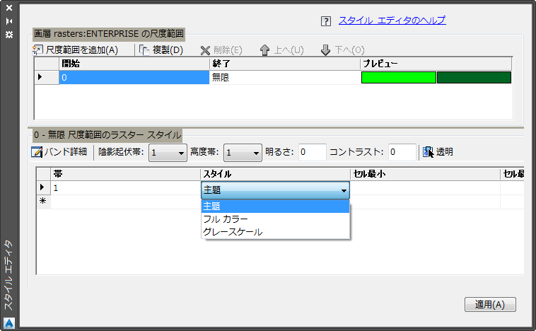 - [スタイル エディタ]の[0 - 無限 尺度範囲のラスター スタイル]で、[スタイル]エントリの下向き矢印をクリックします。[主題]を選択します(既に選択されている場合でも選択します)。