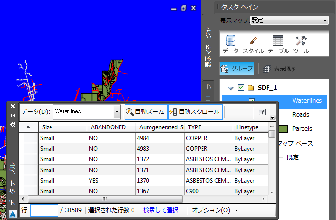 一般的なプロパティと Waterlines 固有のオブジェクト データが[データ テーブル]に表示されます。