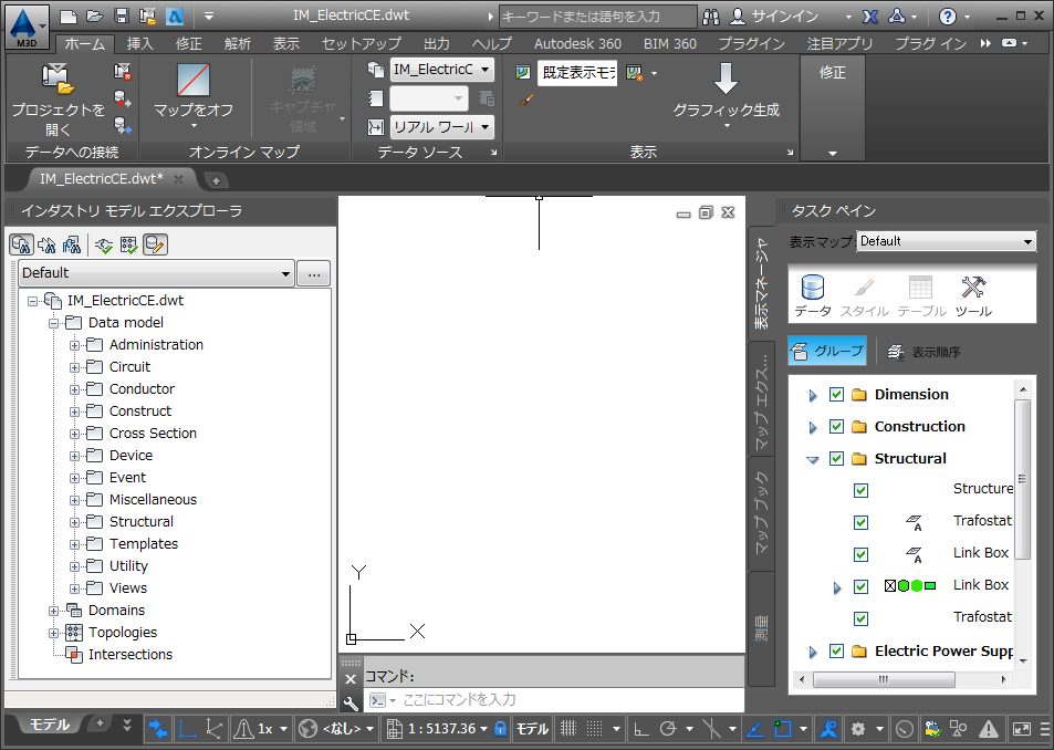 インダストリ モデルのテンプレートでは、左側のインダストリ モデル エクスプローラにデータ モデル、右側の[タスク]ペインに事前定義済みのインダストリ固有のフィーチャ クラスのセットが表示されます。メンテナンス ワークスペースのリボンは、インダストリ モデル向けに最適化されます。
