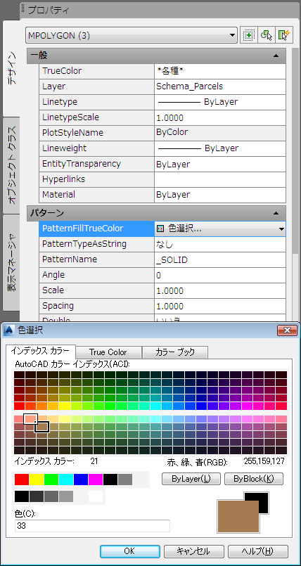 [プロパティ]パレットを使用して、Parcels オブジェクト クラスのすべてのオブジェクトの塗り潰し色を変更します。