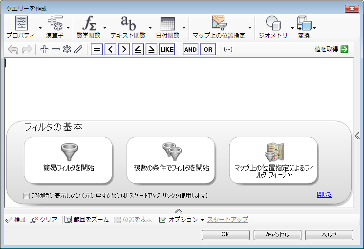 実際には、式を作成する前に、クエリーするフィーチャのクラスまたは画層を選択して、データ セットを指定します。式を作成するコマンドを選択するときに、適用する操作を指定します。たとえば、AutoCAD Map 3D toolset では、[クエリーによってマップに追加]または[検索して選択]を選択します。