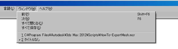 3ds Max 2008 で導入されたタブ付きの MAXScript エディタ の[ウィンドウ]メニューには、開いている複数ファイル間の切り替え、開いている全ファイルのクローズと保存、開いている任意のファイルへの直接切り替えを行うためのコマンドがあります。