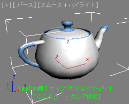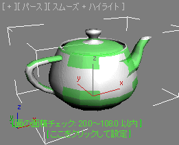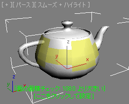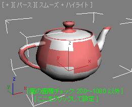 以下の例は、編集ポリゴンに集約された 4 つのセグメントを持つ半径 40 のティーポットに、6 つすべての面領域 xView チェッカーを適用したものです。