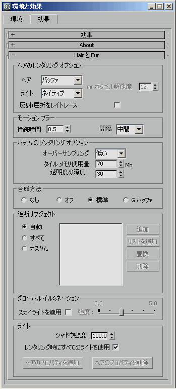 3ds Max 8 以降で提供されている HairEffect RenderEffect は、ヘアのレンダリングに関連します。