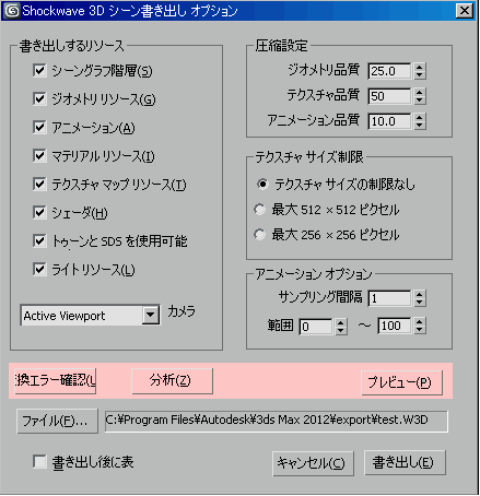 Shockwave 3D 書き出し用ダイアログ ボックス で[プレビュー](Preview)ボタンを押す操作に相当し、Shockwave 3D に書き出されるシーンのプレビューを作成します。