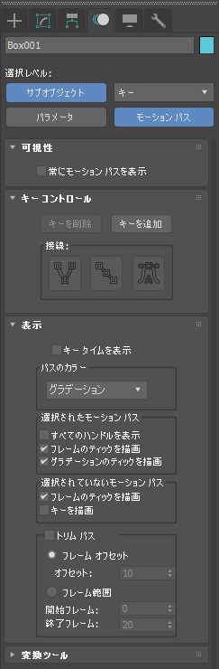 true に設定した場合は、選択解除したモーション パスに沿ってキーが表示されます。 3ds Max 2018 以降で使用可能です。