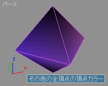 例に示したとおり、 meshop.setMapVert を使用して、アルファ チャネル -2 のマップ頂点の値を、ビューポートで表示されるカラーに設定することができます。アルファ チャネル -2 は、頂点カラー チャネル 0 と同じ方法で使用される通常のマッピング チャネルにすぎません。