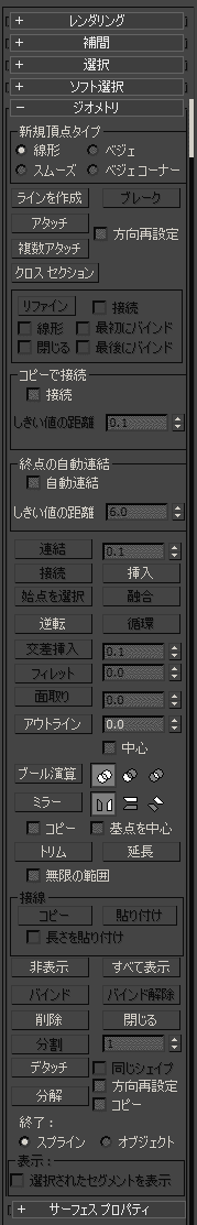 UI に関連するメソッドの完全なリストについては、「編集可能スプラインの修正パネル コマンド モードおよび操作」を参照してください。