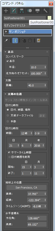 MAXScript を使用して太陽の位置を手動で取得/設定します。