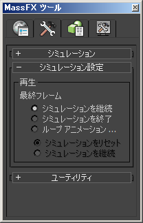 1 - シミュレーションを継続 - タイム スライダが最終フレームに達した後も、シミュレーションの実行を継続します。