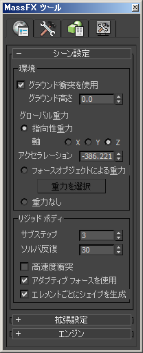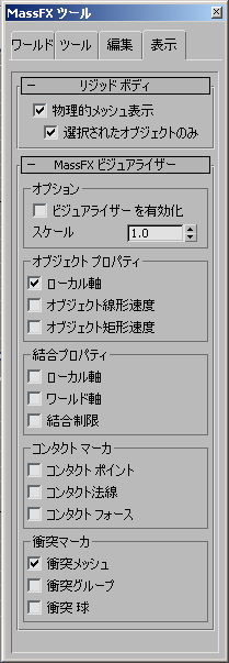 このクラスのインスタンスを作成することは可能ですが、MassFX システムが実際の[MassFX ツール](MassFX Tools)ダイアログのインスタンスを独自に作成するので、ユーザーが作成しても無意味です。