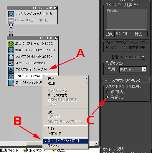 パーティクル フローを使用すれば、ユーザは、MAXScript によって生成されるパーティクル チャネルから、特定のフォース関連のオペレータの影響をコントロールできます。この機能はパーティクル ワイヤリングと呼ばれ、パーティクル フロー ユーザ インタフェースにおいて非表示のオプションです。