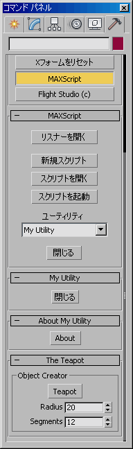 上記のスクリプトによって作成された[ユーティリティ](Utilities)パネル ロールアウトは、次のようになります。