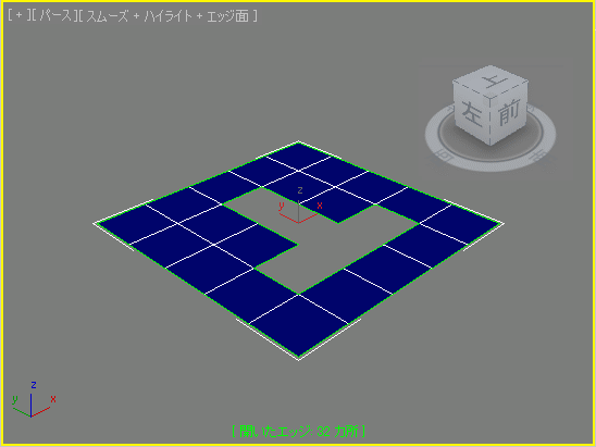| 以下のコードでは、5x5 のセグメントを持つ平面を作成し、これを編集可能ポリゴンに集約した後、内側のポリゴンを T 字型に削除しています。これにより開いたエッジの数が増えます。