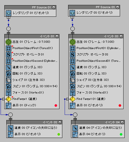 このスクリプトは、対応するアクションおよびイベントを備えたジオメトリ プリミティブと PF_Source を 2 つずつ作成します。