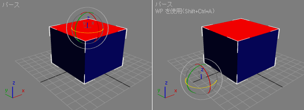 右: カスタムの[作業基点 (WP) を使用](Use Working Pivot)キーボード ショートカットを押したままにすることで、現在のモードを上書きし、作業基点座標系の使用に切り替えます。