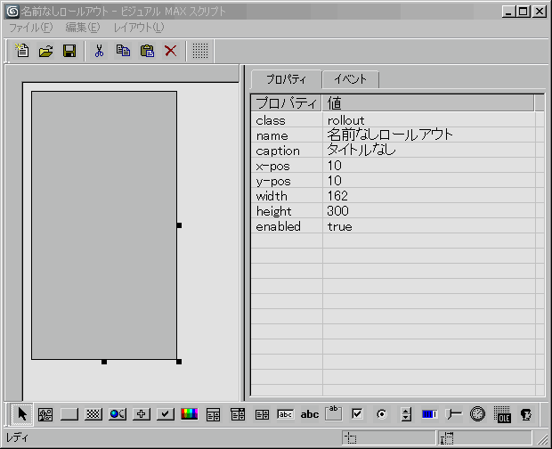 レイアウト エディタはエラーのないソースに関してのみ開くことができます。レイアウト エディタでロールアウトを初めて編集または作成するとき、コマンド パネル ロールアウトの標準の幅がレイアウト エディタの既定の幅として使用されます。この幅は、エディタ内で外側の灰色の長方形と、生成されたロールアウト ヘッダ上のエディタ放出幅:および高さ: のパラメータ サイズを変更して調整できます。スクリプト エディタでこれらの数値を編集すると、次に該当するロールアウトをレイアウト エディタで編集するときに、編集後の数値が採用されます。
