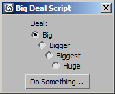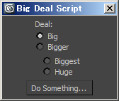 radiobuttons rad_buttons "Size:" labels:#("Big", "Bigger", "Biggest", "Huge") columns:2