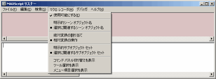 次のマクロ レコーダ メニュー コマンドは[リスナー](Listener)で使用できます。