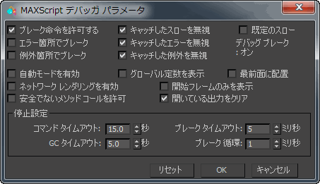 [コマンド タイムアウト](Command Timeout) (秒)- この値によって、デバッガがコマンドの実行を待機する時間 (秒) を指定します。この秒数を過ぎると、コマンドの実行が中止されます。つまり、何らかの理由でコマンドによって 3ds Max がハング アップしてしまっても、ここで指定した時間を過ぎると無事にデバッガに制御が返されます。既定値は 15 秒です。