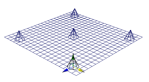- 既定のオプションをそのまま使用して、5 つの NURBS 円錐を作成します。これらのコーンをプレーン上に次のように配置します。