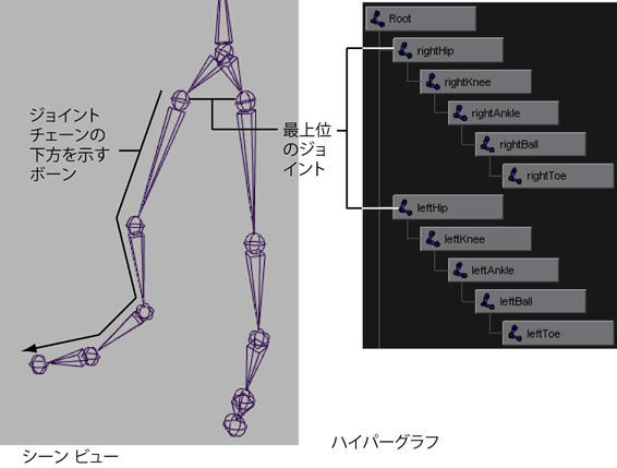 ジョイント チェーンとは、ジョイントとボーンが一連に接続されたものです。ジョイントは直線的に接続され、このパスがボーンとしてシーンに描画されます。ジョイント チェーンは、チェーンの階層上の最上位にあるジョイントから始まり、チェーンの下方を示すボーンが描画されます。